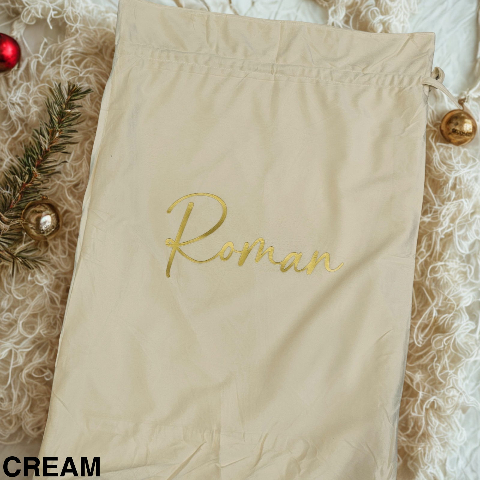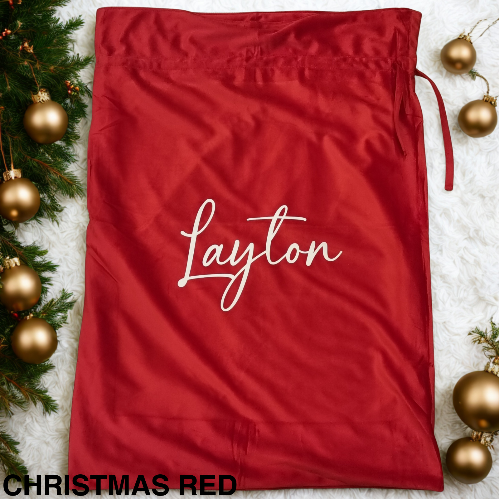 Each sack comes personalised with a name in your choice of font and colour in a permanent heat vinyl name. Matching stockings also available.