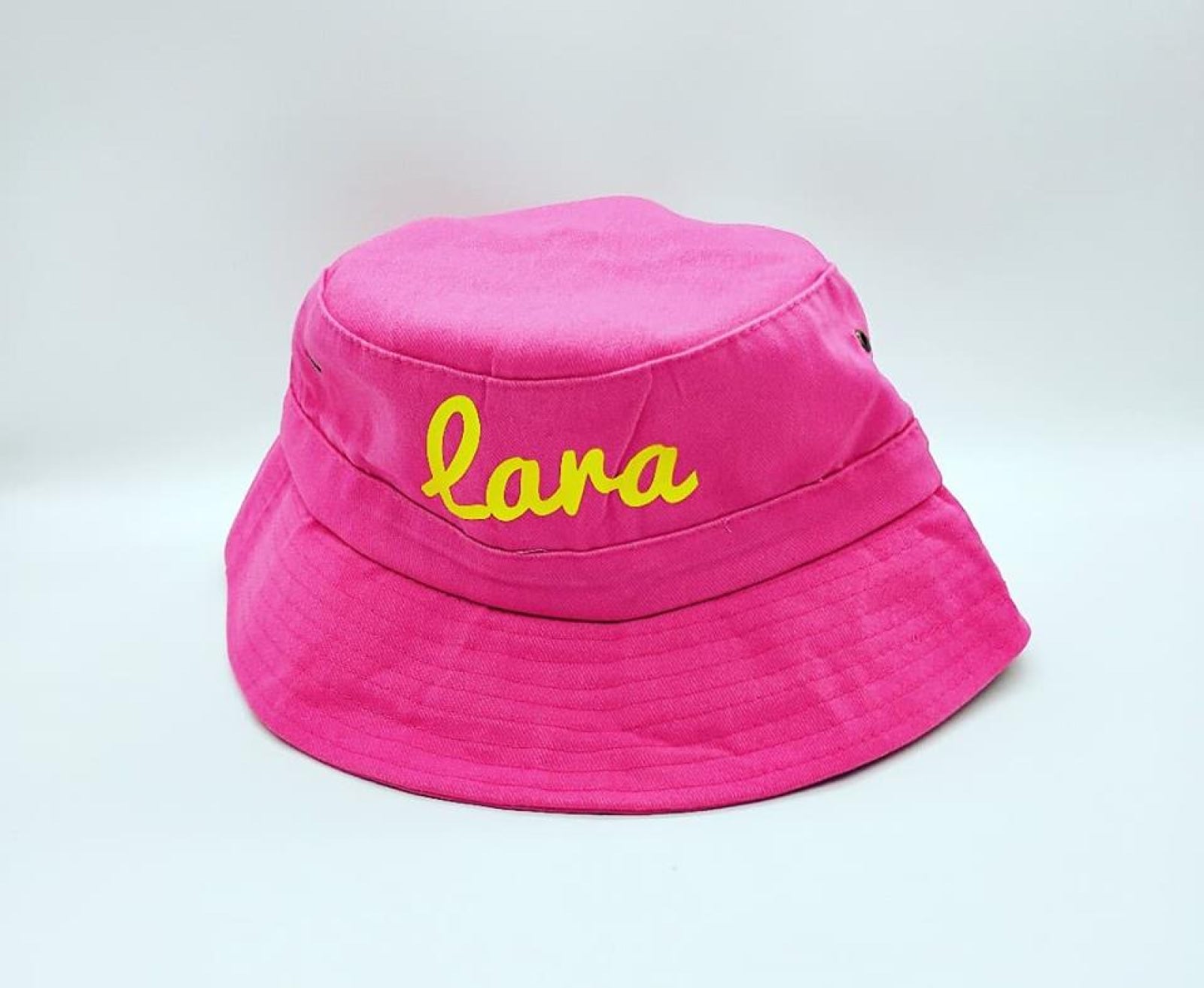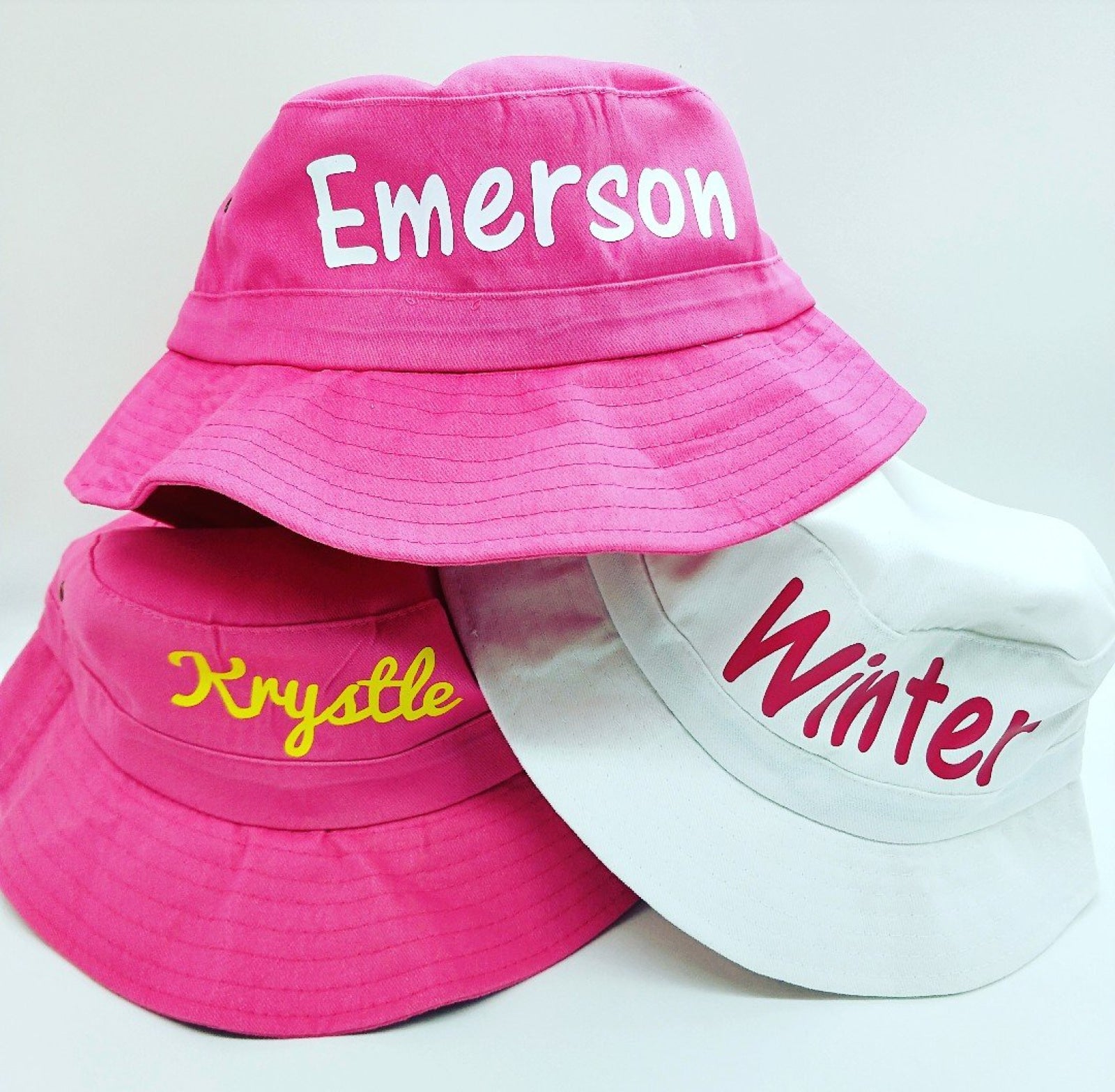 Available in an assortment of sizing and colours, personalised with a name in your choice of font and colour in a permanent heat vinyl on the front panel. Perfect for daycare, the beach or fun in the sun. Made with soft and breathable material with a lightweight design perfect for all day wear. Each hat has a sun safe 6cm brim and a toggle at the back to adjust the size. Available in 50cm, 54cm and 58cm.