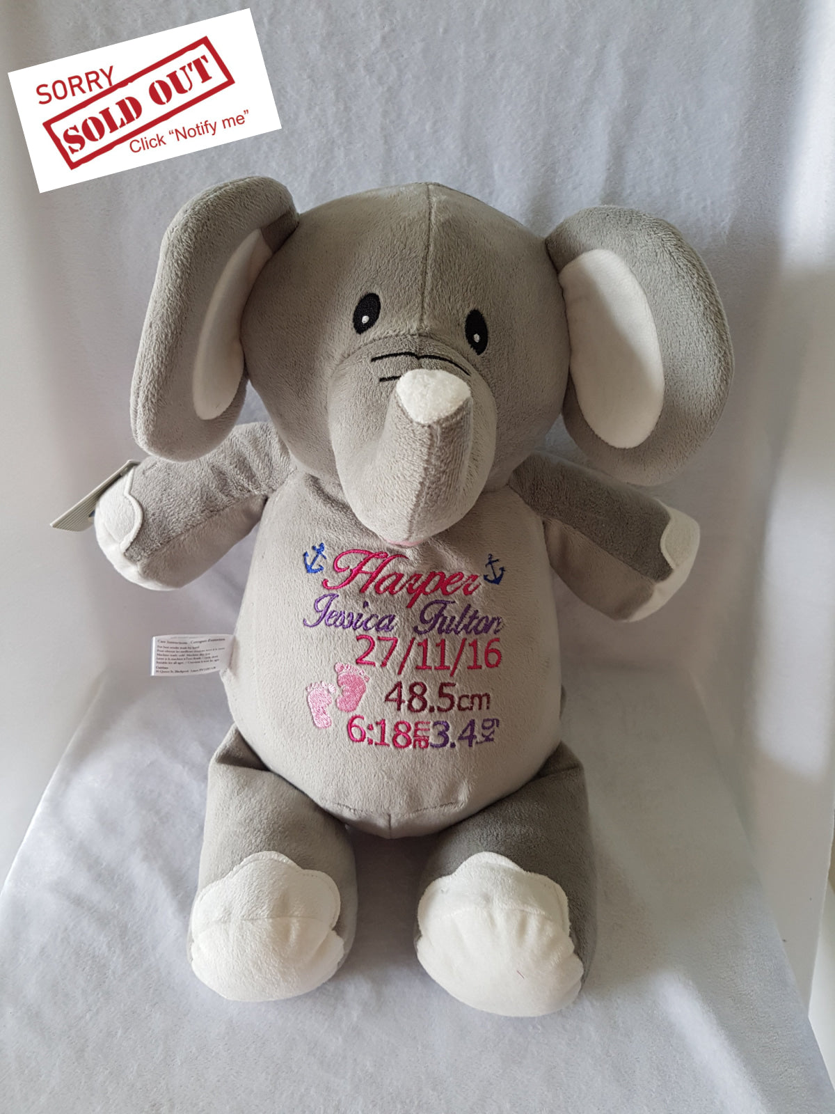 Personalised plush toy with birth details or your own message in your choice of colours. Our teddies sitting at just over 30cm are popular for all ages and occasions including gifts for new parents to welcome a new born baby, first birthdays, christenings or any other celebration. Our teddies make gorgeous gifts and keepsakes for any age or occasion that can be cherished for years. All embroidery is designed when you place an order, making your personalised teddy even more unique. A design proof will be sent to you for approval prior to stitching.