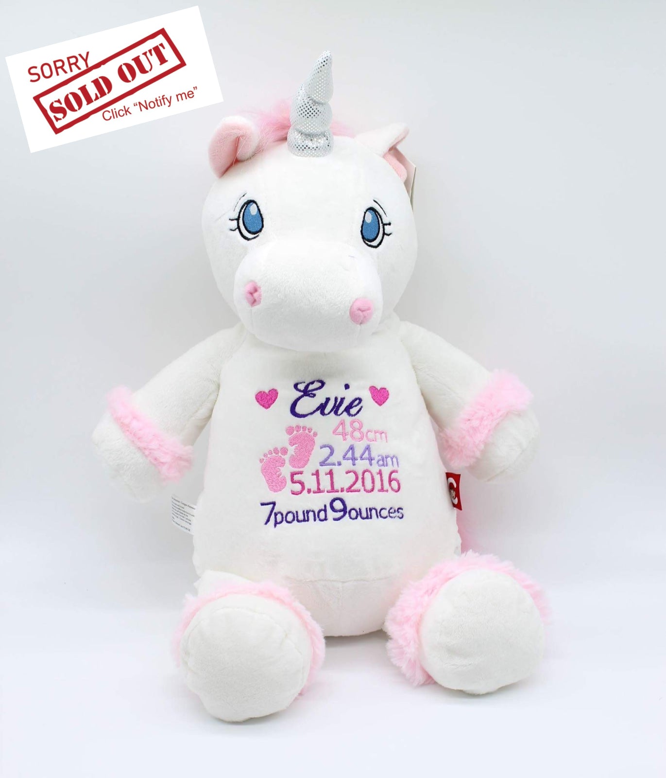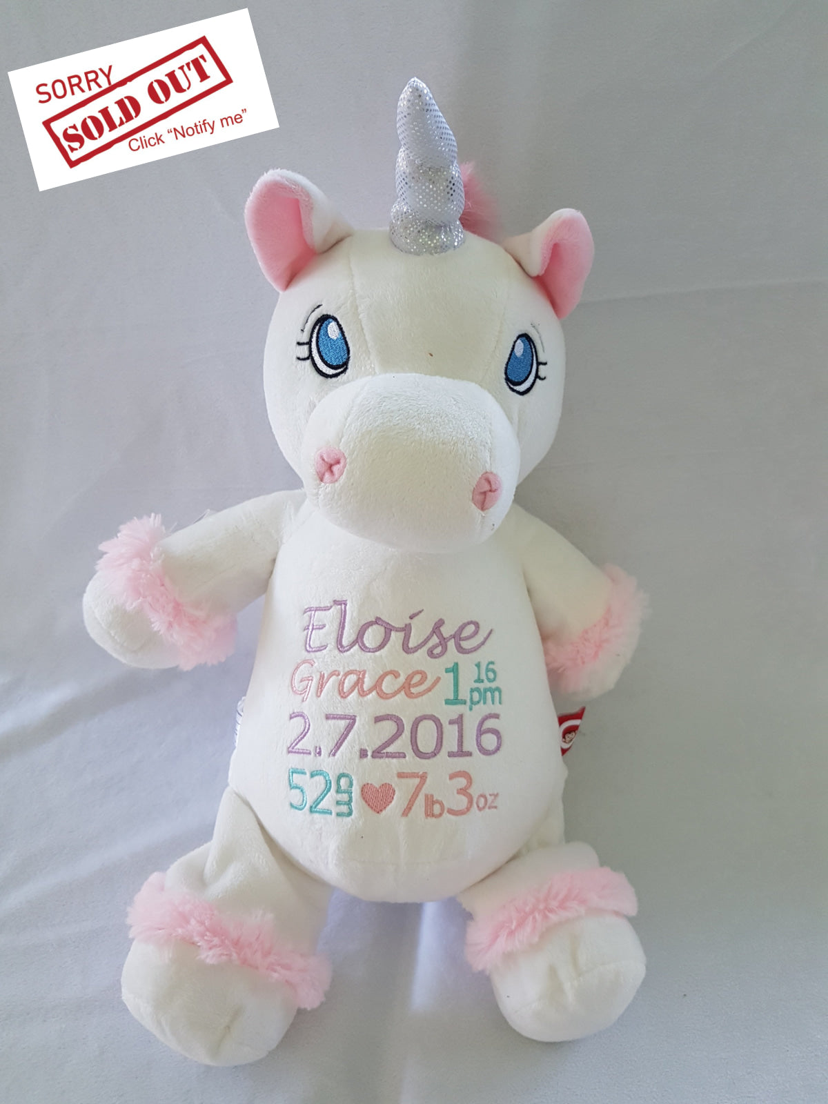 Personalised plush toy with birth details or your own message in your choice of colours. Our teddies sitting at just over 30cm are popular for all ages and occasions including gifts for new parents to welcome a new born baby, first birthdays, christenings or any other celebration. Our teddies make gorgeous gifts and keepsakes for any age or occasion that can be cherished for years. All embroidery is designed when you place an order, making your personalised teddy even more unique. A design proof will be sent to you for approval prior to stitching.