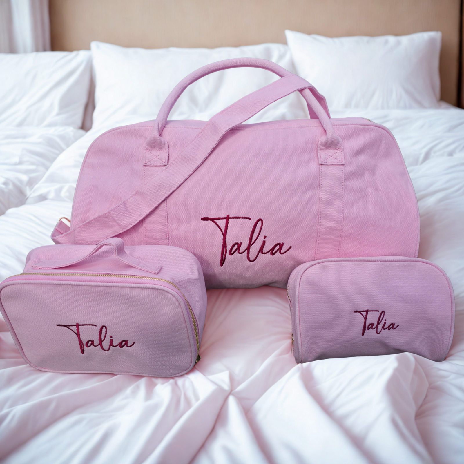 The perfect travel companion, meet our new gift set, perfect for yourself, your best friend, tween, teen, mum or anyone in between! Embroidery is included on all three pieces in your choice of font and colour.