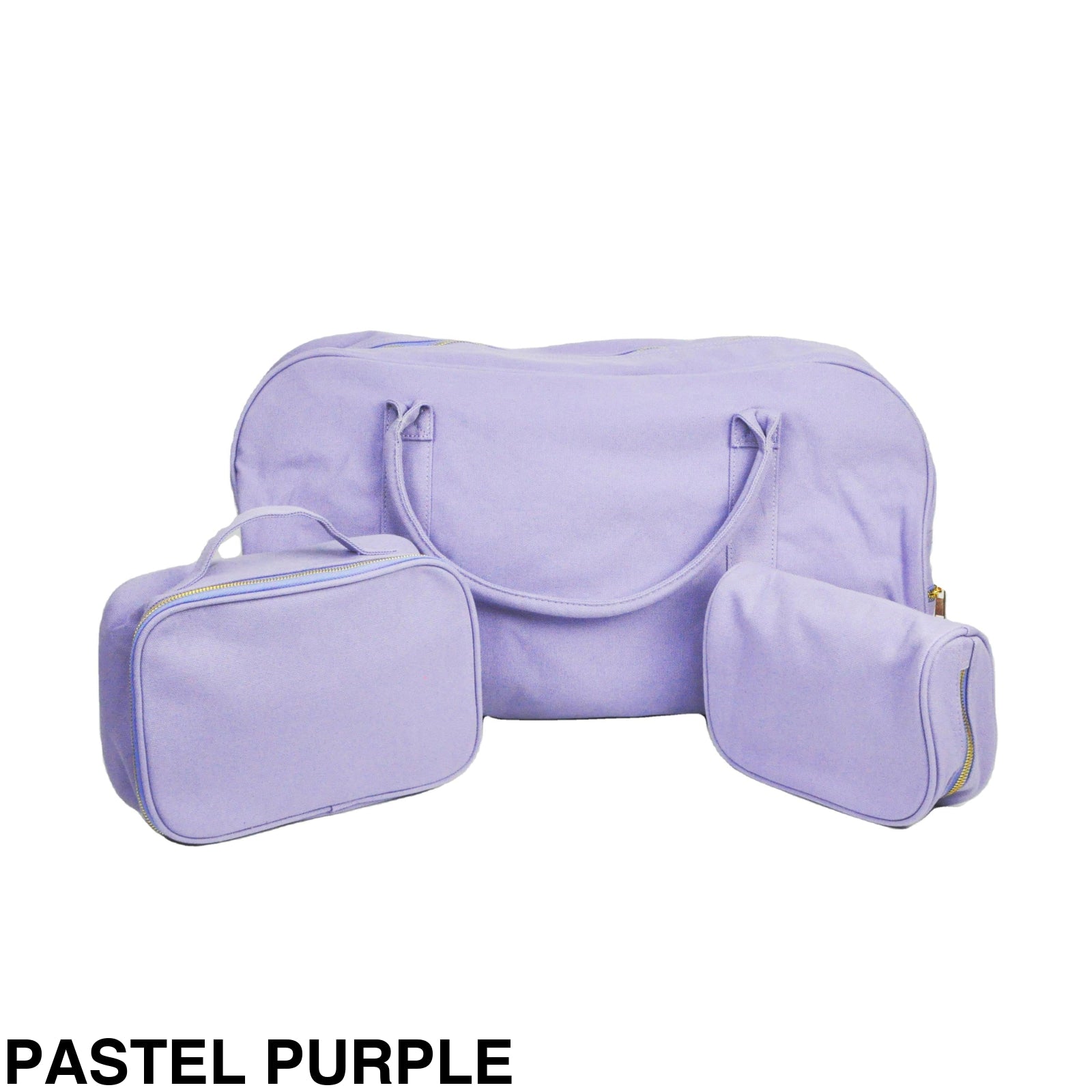 Included is a duffle bag, toiletries bag and cosmetic bag in your choice of colour from our range, made from 100% cotton with gold zippers and machine washable.