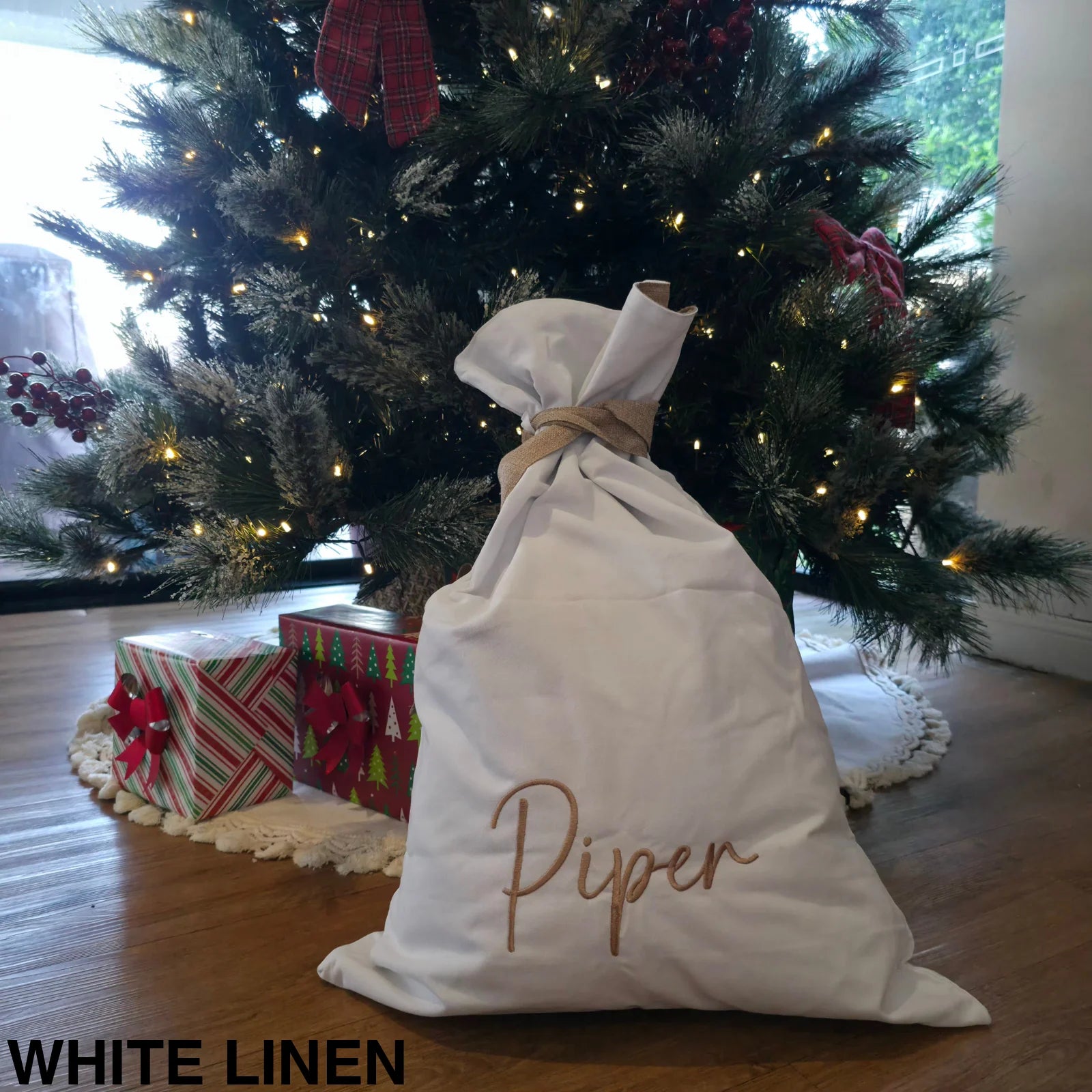 Our embroidered Santa Sacks are perfect for under the Christmas tree, they come from two different options, a white linen option with a beige canvas tie that has a matching canvas trim in top inside or the second option is the reversed, the beige canvas with the white linen trim and tie. They measure approximately 50x70cm so a good size for under the Christmas tree with a easy tie up.