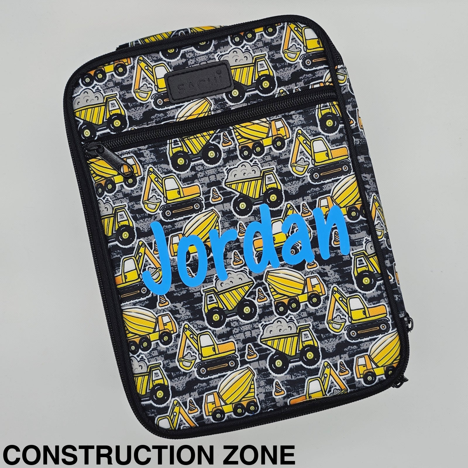 The reinforced base and handy top grab handle suit the everyday use of school life. A front pocket lets you slip in bus pass or phone while you are out for a picnic lunch and the clear view internal pocket can be used for an ice brick or extra snacks.