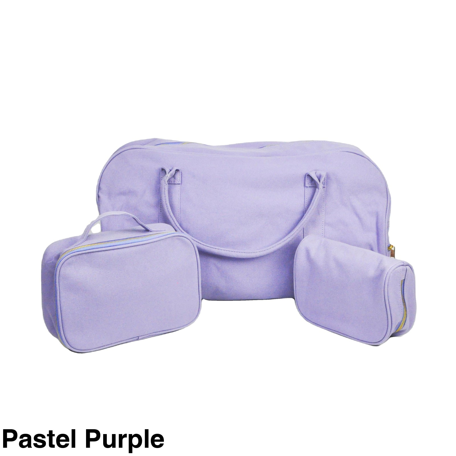 Included is a duffle bag, toiletries bag and cosmetic bag in your choice of colour from our range, made from 100% cotton with gold zippers and machine washable.
