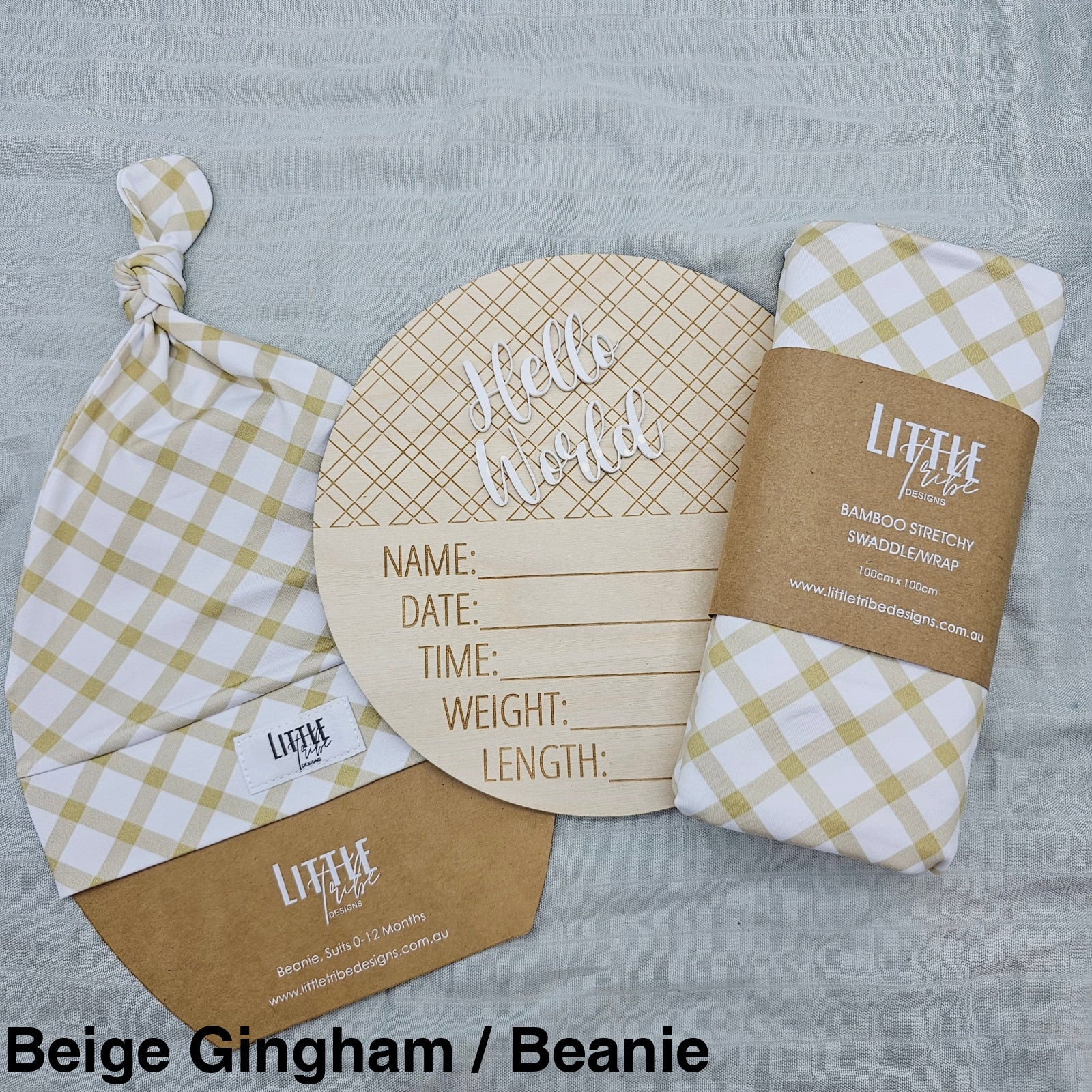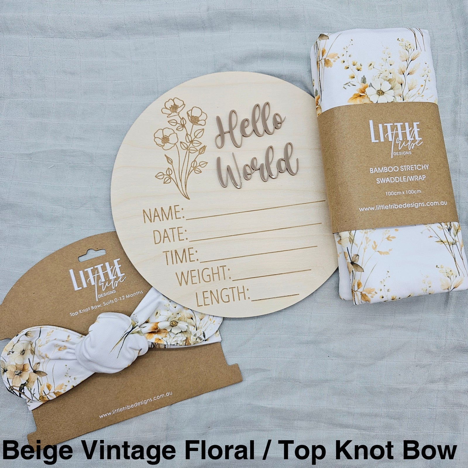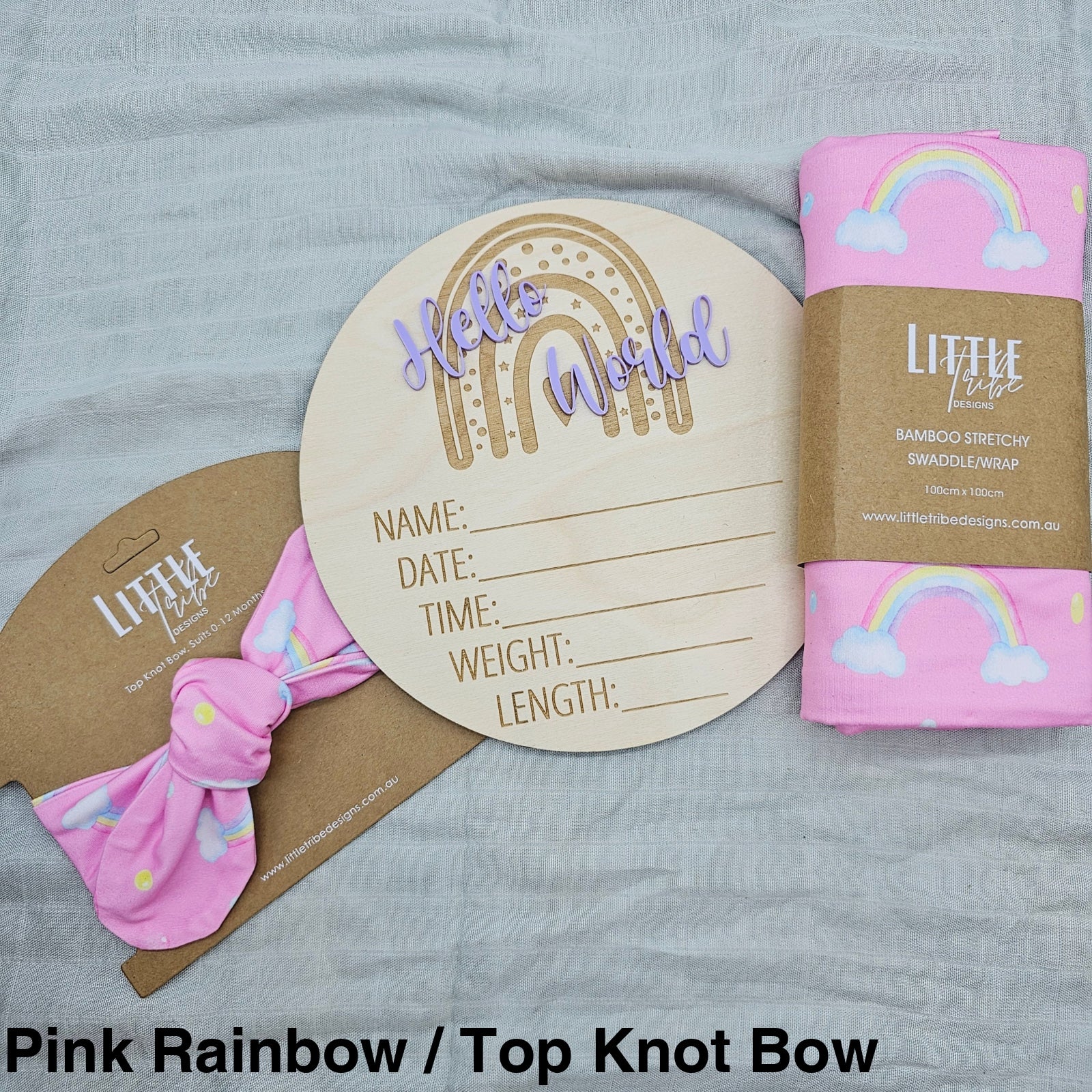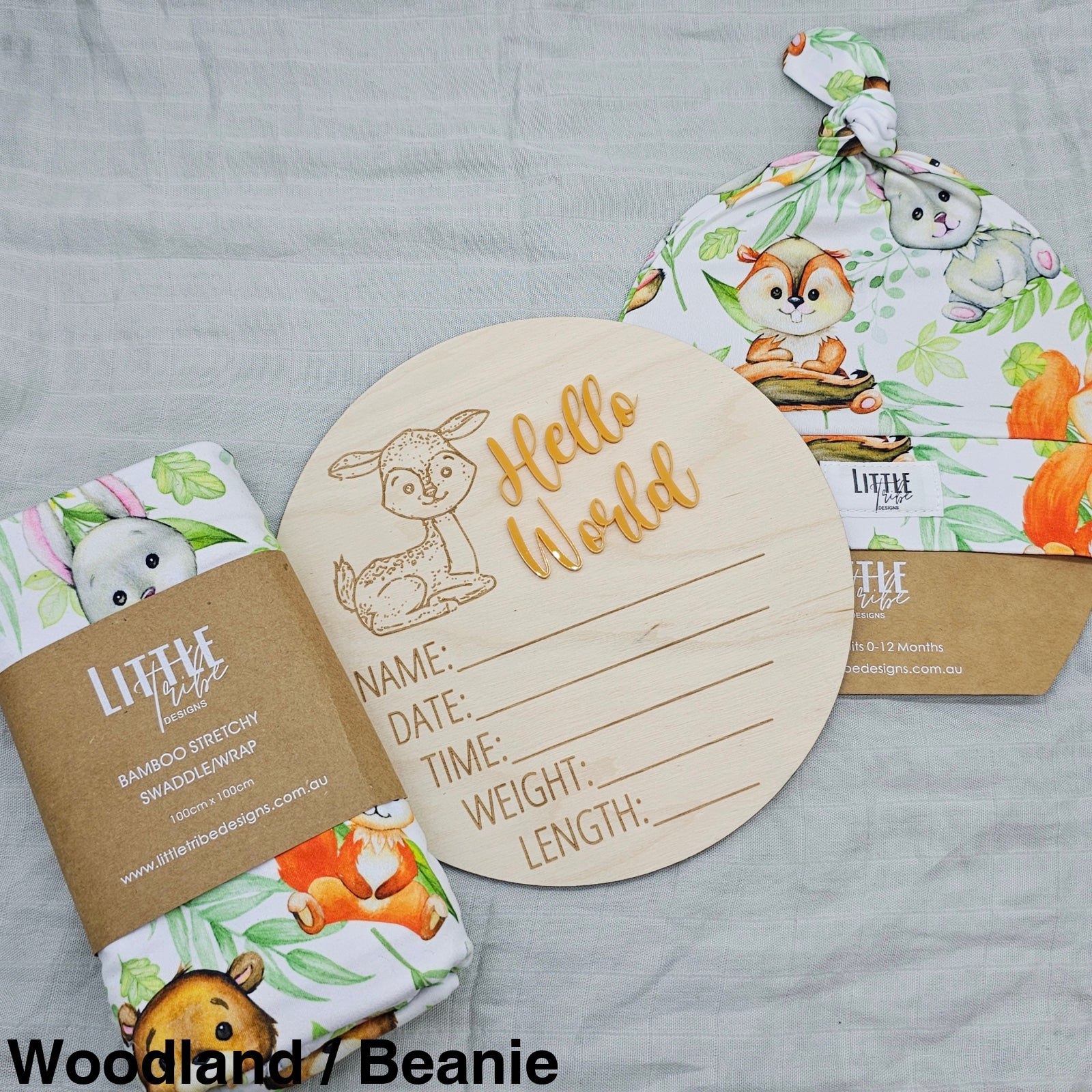 Our announcement sets include a wooden engraved 20cm Hello World Announcement Disc, a super soft and stretchy bamboo snuggle stretch wrap and either a bamboo beanie or bamboo top knot bow; all in a matching design ready for a gorgeous announcement picture and keepsake!