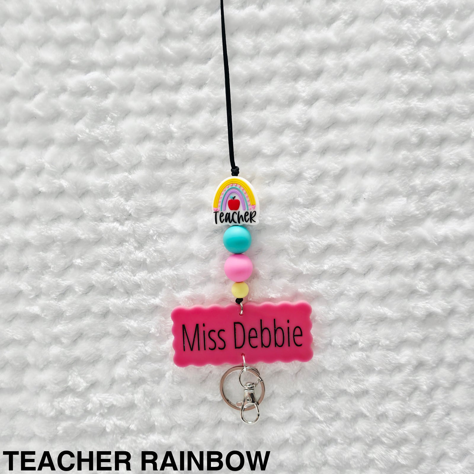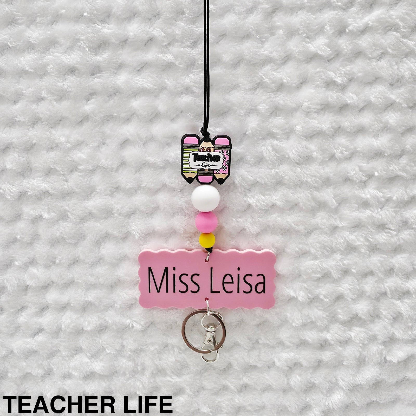 Features an acrylic scallop edge name plaque that is personalised with any name in your choice of font. Perfect for busy lifestyle, teacher's gifts and more! Style your keys and ID's and never loose them again!