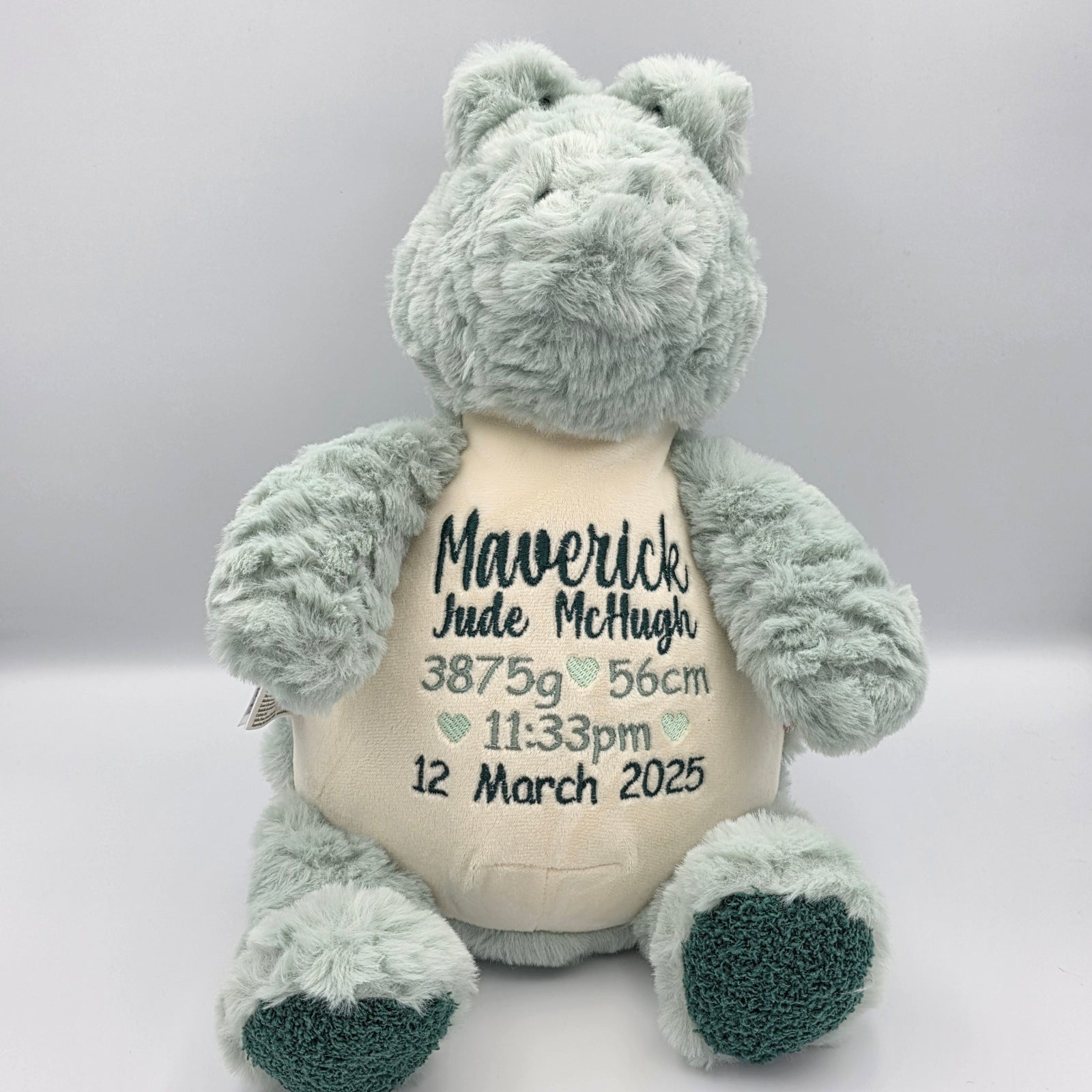 Personalised plush toy with birth details or your own message in your choice of colours. Our teddies sitting at just over 30cm are popular for all ages and occasions including gifts for new parents to welcome a new born baby, first birthdays, christenings or any other celebration. Our teddies make gorgeous gifts and keepsakes for any age or occasion that can be cherished for years. All embroidery is designed when you place an order, making your personalised teddy even more unique. A design proof will be sent to you for approval prior to stitching.